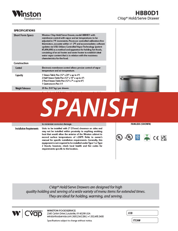 HBB0D1 CVAP® HOLD AND SERVE DRAWER - SPEC SHEETS